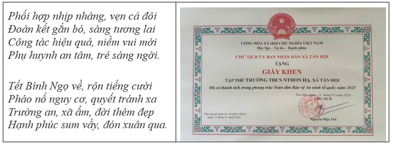 Trong những năm qua, công tác phối hợp giữa Trường THCS N’Thôn Hạ và Công an xã Tân Hội tỉnh Lâm Đồng luôn được thực hiện đầy đủ, kịp thời và đạt kết quả tốt. Sự phối hợp nhịp nhàng này là một trong những yếu tố then chốt giúp nhà trường nhiều năm liền được khen thưởng về thành tích đảm bảo an ninh, an toàn trường học, tạo dựng môi trường giáo dục ổn định, lành mạnh.