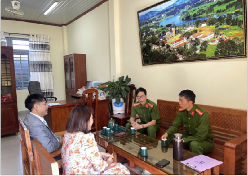 Ban giám hiệu nhà trường trao đổi cùng công an xã Tân Hội về công tác tuyên truyền thực hiện an toàn giao thông và đảm bảo an ninh trường học.