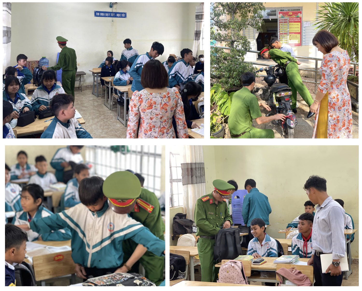 Nhà trường phối hợp cùng công an xã kiểm tra an ninh học đường và việc chấp hành sử dụng phương tiện giao thông của học sinh