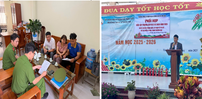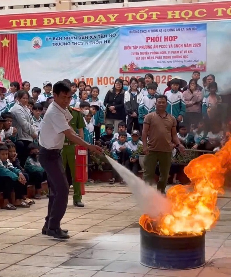 Bước vào những tháng đầu năm 2026, bối cảnh Tây Nguyên đang ở cao điểm mùa khô hanh, tiềm ẩn nguy cơ cháy nổ cao, đồng thời học sinh và nhân dân chuẩn bị đón Tết Nguyên đán Bính Ngọ. Nhận thức rõ tầm quan trọng của việc chủ động phòng ngừa, ngay từ những ngày đầu năm, Ban Giám hiệu Trường THCS N’Thôn Hạ và Công an xã Tân Hội đã thống nhất kế hoạch phối hợp tổ chức các hoạt động thiết thực. Trọng tâm là diễn tập phương án Phòng cháy chữa cháy và Cứu nạn cứu hộ (PCCC&CNCH), cùng đợt tuyên truyền sâu rộng về phòng, chống việc tàng trữ, buôn bán, sử dụng vũ khí, vật liệu nổ, đặc biệt là pháo nổ trong dịp Tết. Các hoạt động này đã được triển khai nghiêm túc vào chiều ngày 29/01/2026.