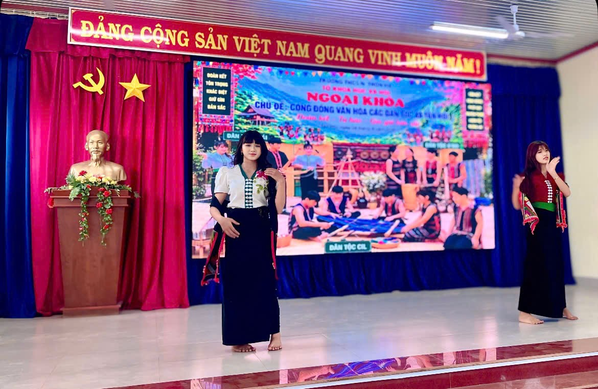 Học sinh tự tin trình diễn trang phục truyền thống của các dân tộc Kinh, K’Ho, Thái… với màu sắc và hoa văn đặc trưng.